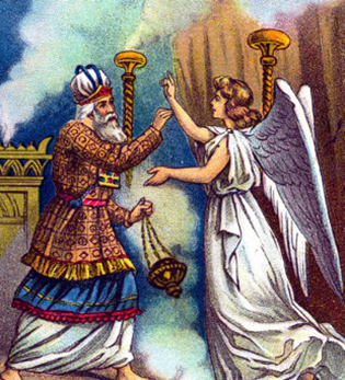 Minsan, habang naglilingkod si Zacarias sa harap ng Diyos nang turno pa kanyang pangkat nagpalabunutan sila ayon sa kaugalian ng kaparian at siya ang napiling pumasok sa santuwaryo ng Panginoon para magsunog ng insenso.  Kaya sa oras ng pag-aalay ng insenso habang nananalangin ang buong bayan sa labas, nagpakita sa kanya ang anghel ng Panginoon, nakatayo sa gawing kanan ng altar ng insenso. Naligalig si Zacarias at sinidlan ng takot pagkakita rito.